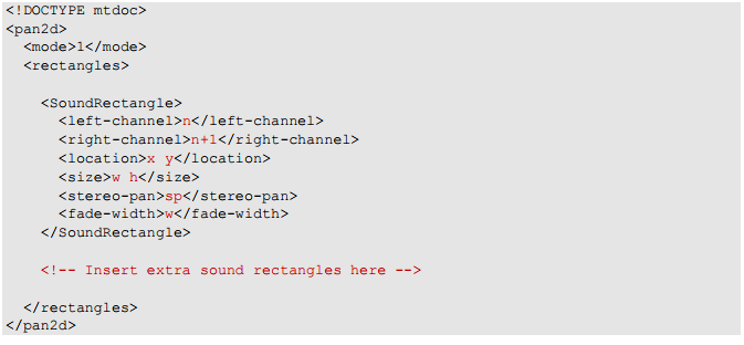 whdefine the width and height of the zone, in pixels. - stereo-pan: Controls audio attenuation on the zone's left and right channels. Audio output changes on each channel dynamically as the sound source moves. Permitted values range from 0 to 1. The default is 0.3, meaning that when the sound source is fully on the right, audio output on the left channel falls by 30%. (That is, when the right channel audio is 100%, the left channel is 70%. Likewise, when the left channel audio is 100%, the right channel is 70%.)