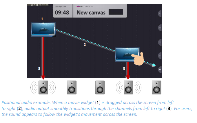 But you can configure MT Canvus to support positional audio. When positional audio is enabled on your application computer, sounds are directed to the nearest speaker. This is useful on large video walls. If the sound source moves away from one speaker towards an adjacent speaker (for example, if a user drags a movie widget), audio output smoothly shifts from the first speaker to the second.